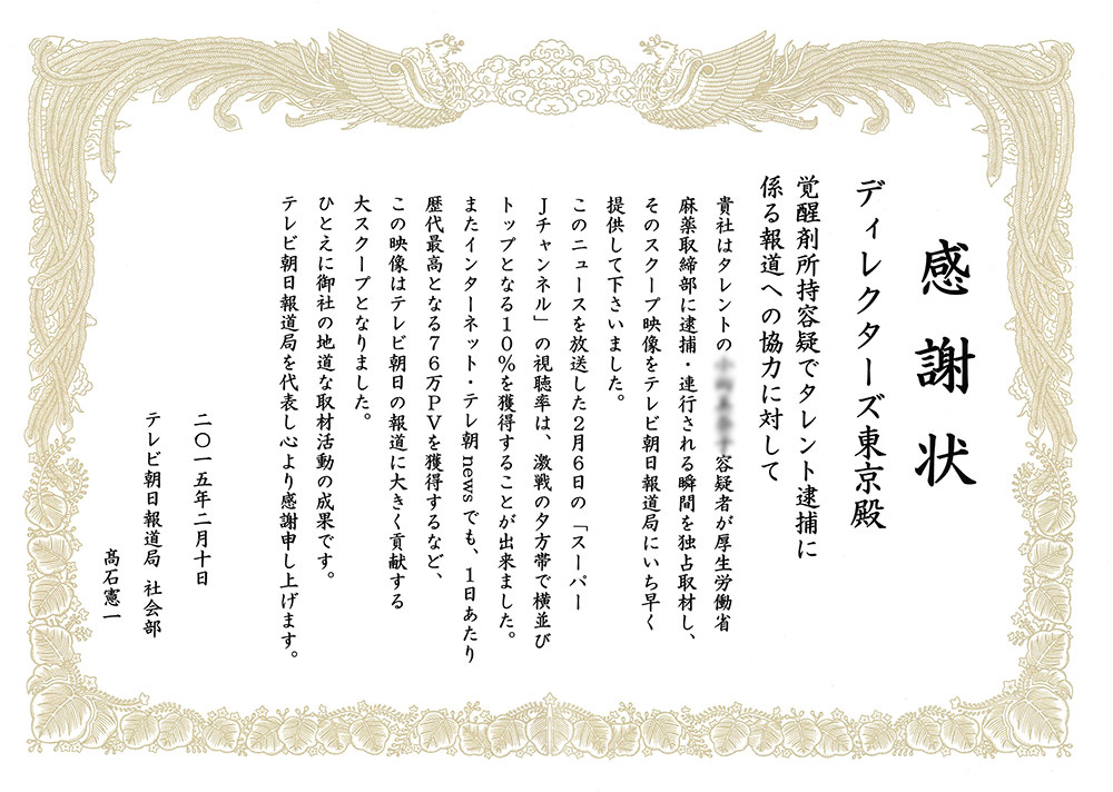 覚醒剤所持容疑でタレント逮捕に係る報道への協力